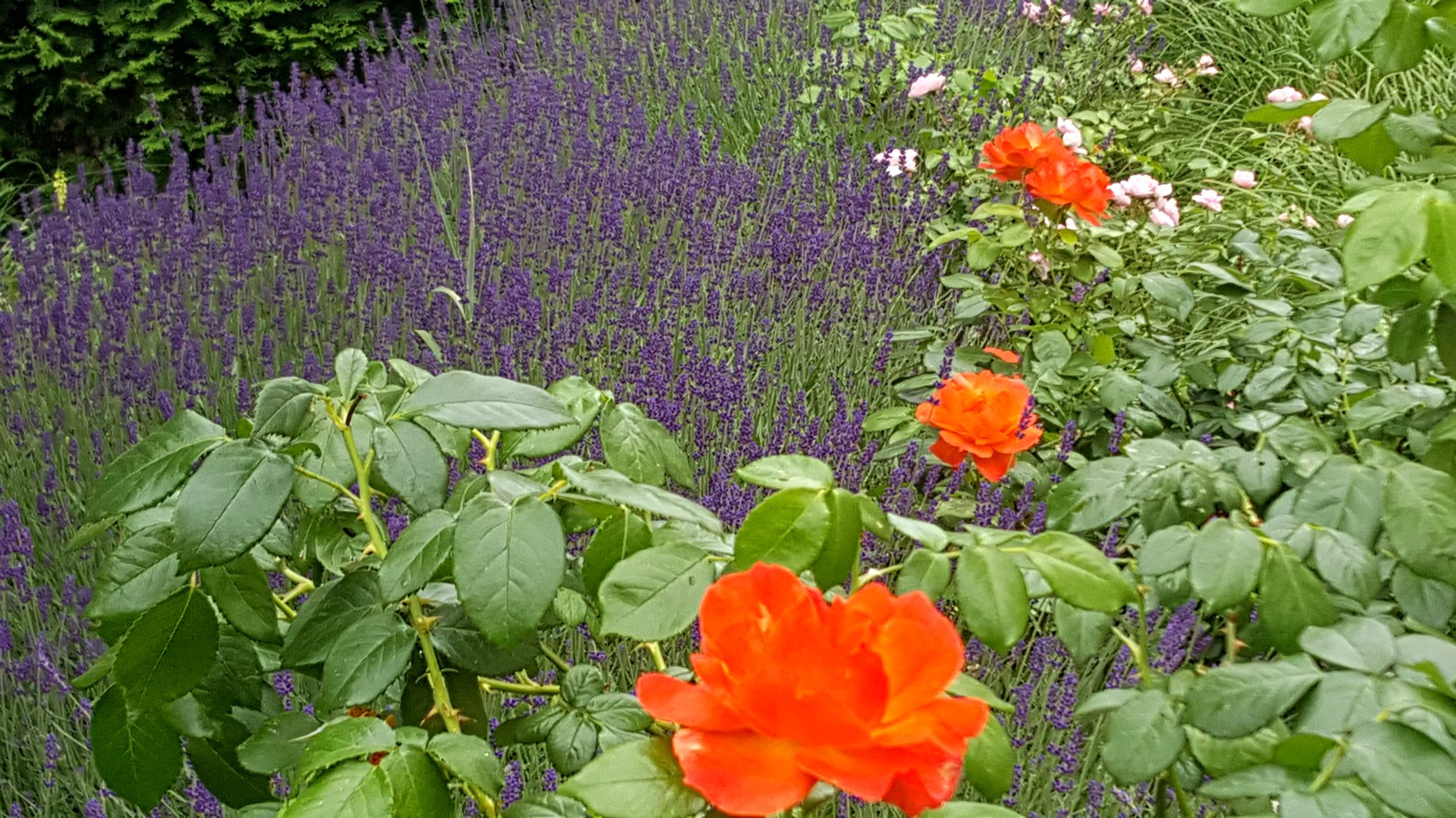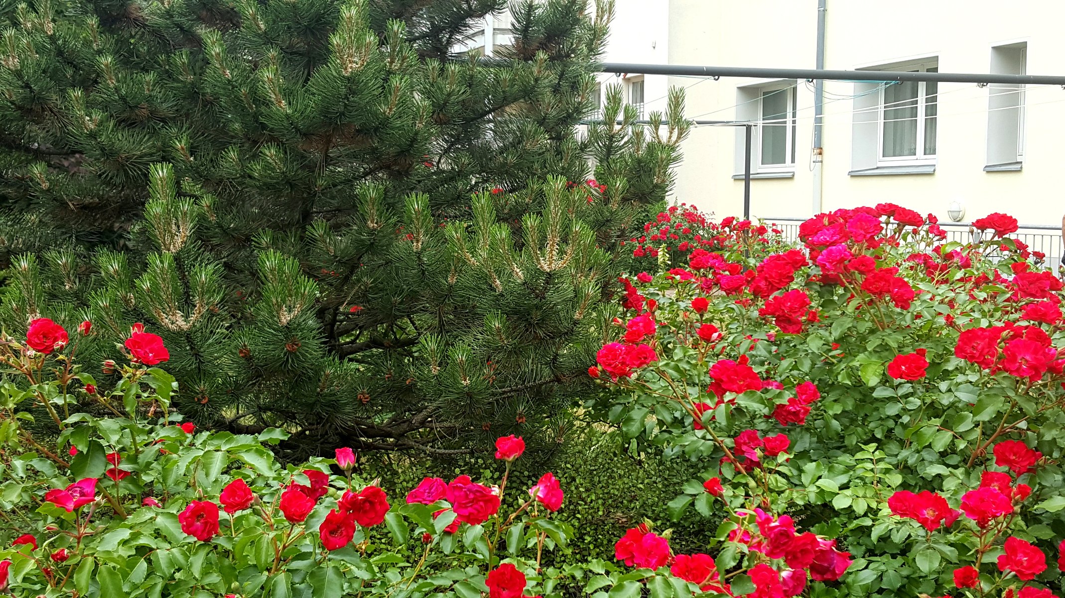 Hinter dem Haus könnten Sie das malerische Farbspiel vieler Rosen sehen, die sich vor einem Lavendelbeet perfekt in Szene setzen. Zahlreiche Sträucher in verschiedenen Grüntönen wurden liebevoll gepflanzt und lassen Sie möglicherweise ganz vergessen, wo wir uns befinden: Mitten im zentralen Stadtteil Mockau.