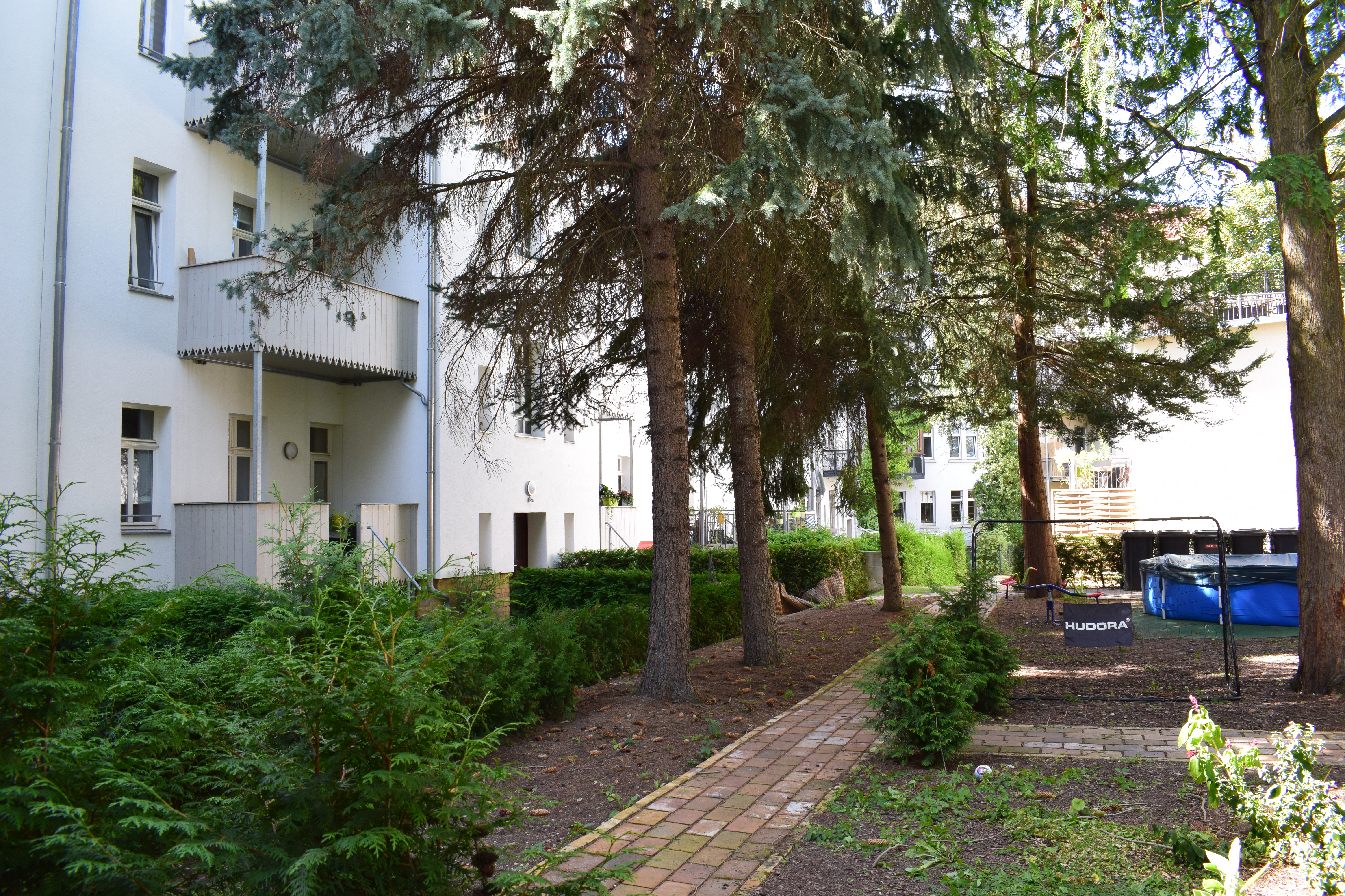 Die Wohnanlage wurde 2012 komplett saniert und umfasst mehrere Hauseingänge mit durchweg 2-3-Zimmer-Wohnungen (50-80qm), welches Paare oder Familien positiv überraschen wird. IDas Haus hat Ihnen neben der hervorragenden Anbindung auch viel GRÜN zu bieten. Beim Gang durch den großen grünen Innenhof/Garten können Sie sich inspirieren lassen und einfach nur zur Ruhe kommen und ein Buch auf einer Bank genießen.