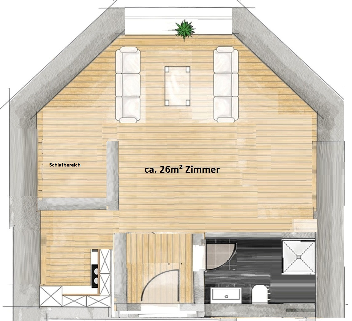 + Schlafbereich durch kleine Wand abgetrennt