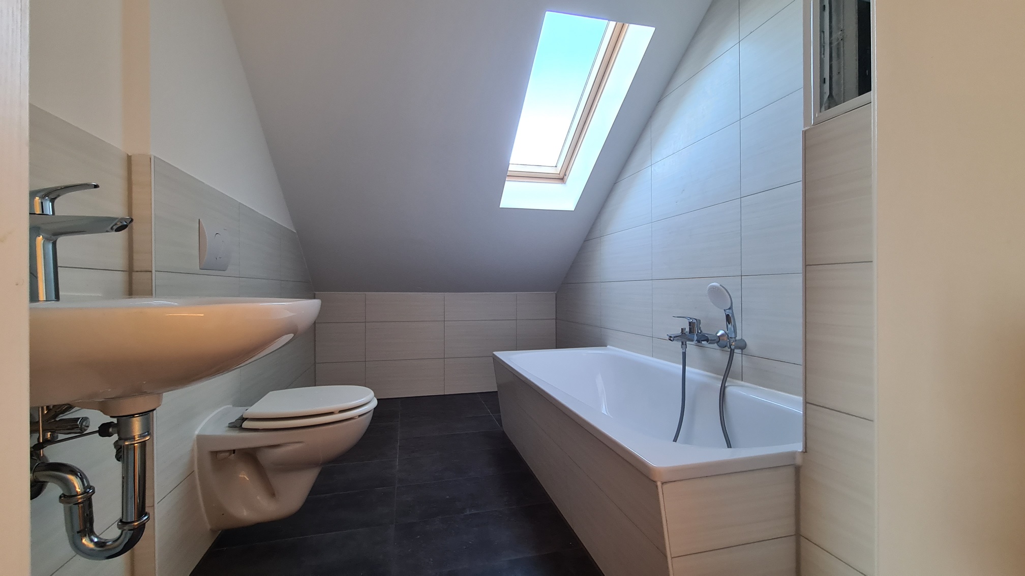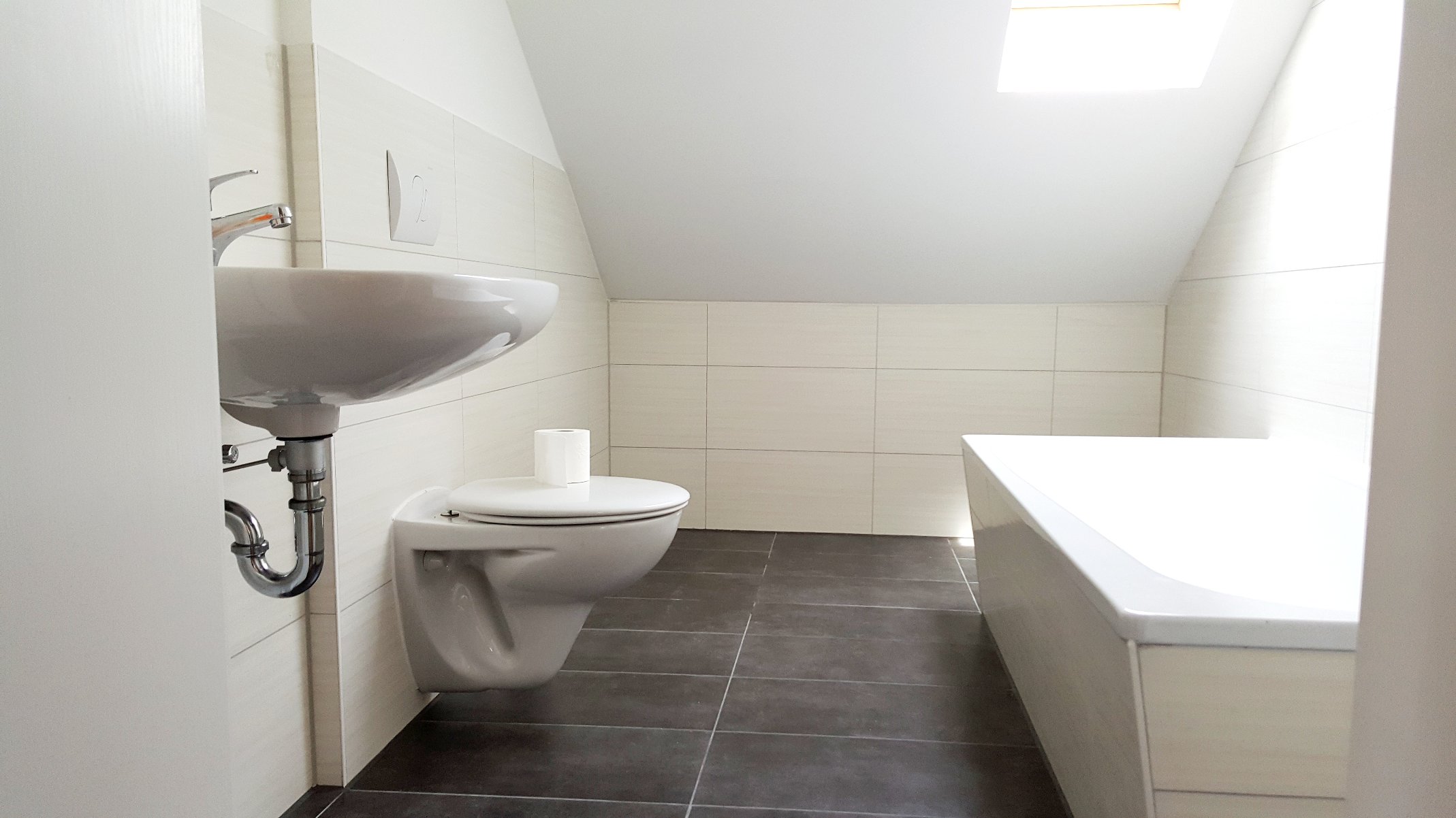 + Bad mit Fenster, Wanne, großformatigen Fliesen, Waschmaschinenanschluss
